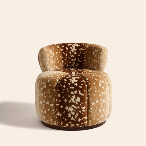 Fauteuil Gainsbourg Clovi Paris, édition exclusive en tissu Nobilis motif Faon. Fauteuil lounge sur-mesure à base fixe ou pivotante, fabrication artisanale française à Lille. Tapisserie personnalisable avec tissus Clovi ou éditeurs (COM).